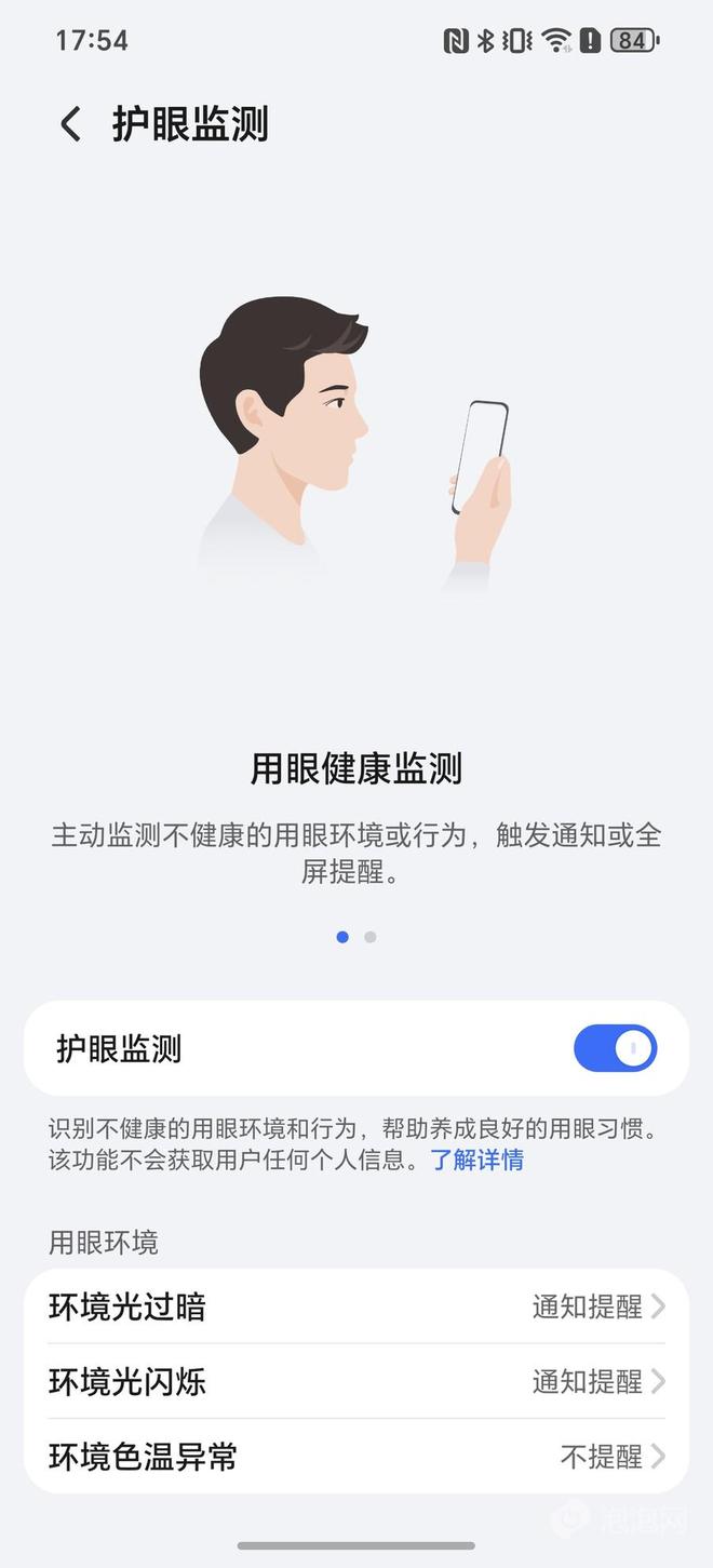 此外,荣耀构建了完整的视觉健康全场景管理系统,具备八大智能感知能力,实时监测用眼距离、环境光线与使用姿态,并在不良用眼习惯出现时发出人性化提醒。系统定期生成可视化护眼报告,提供个性化分析建议,所有数据均在本地处理,隐私安全无忧。