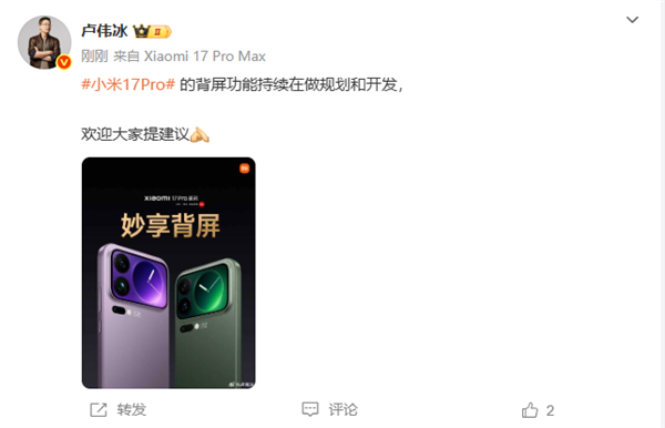 今天,小米集团合伙人、总裁卢伟冰明确表示,针对小米17 Pro背屏的新功能正持续推进规划与开发。