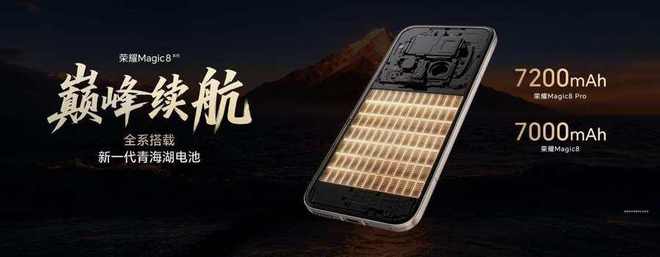 续航方面,荣耀Magic8系列搭载新一代青海湖大电池,全系容量突破7000mAh,并支持120W有线与80W无线双快充,兼容100W PPS充电协议,用电脑充电器也能进行超级快充。而在荣耀都江堰AI电源管理系统和骁龙芯片底层调教下,将典型场景功耗优化了13%,荣耀Magic8 Pro做到了旗舰机续航第 一名,达成巅峰续航体验。