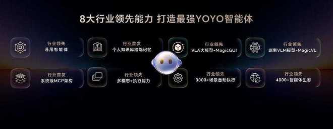 荣耀魔法大模型3.0,具有端云结合的大模型矩阵,在多模态理解、任务规划和工具调用等核心能力上,持续进化,紧密协同,达到比肩SOTA的业界顶尖水平。基于荣耀魔法大模型3.0的YOYO智能体,获得中国信通院L3级卓越型权威认证,代表了当前智能体泛化能力的最高水平。