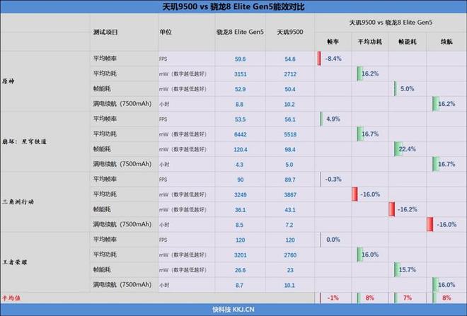 综合4款游戏的测试成绩,天玑9500的能效比较骁龙8 Elite Gen5好了7%,同样7500mAh电池下,它的游戏续航时间要长了8%。