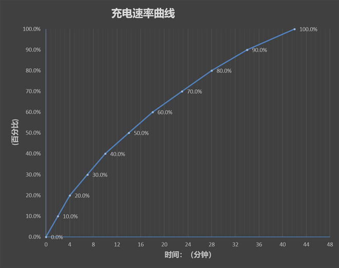 实测10分钟充电40%,28分钟时充到了80%,充满100%共耗时42分钟。
