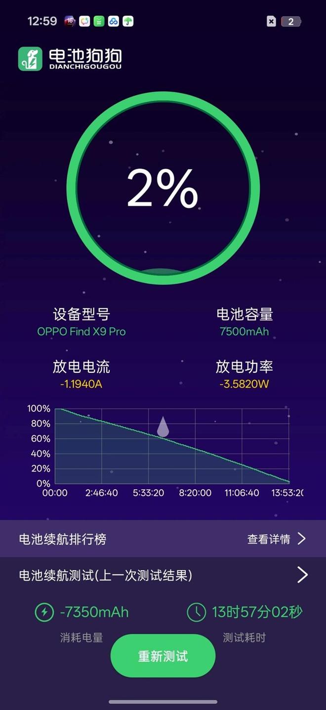 我们使用电池狗狗进行满电续航测试,从100%到2%,共放电7350mAh,OPPOFindX9 Pro共坚持了13小时57分钟。