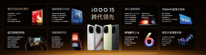 “跨代领先”iQOO 15 传承 iQOO 手机在实力和口碑的双重表现,搭载由第五代骁龙 8 至尊版领衔的“至尊性能组合”完全体,实现行业领先的性能表现,并在自研电竞芯片 Q3 和 Monster 超核引擎的支撑下,带来“全场景光线追踪+ 2K 原画超分+144FPS 无损超帧”,共筑行业领先游戏视效生态;更以全新演绎的国潮设计、超级潜望长焦以及更流畅智慧的 OriginOS 6等一系列强悍配置,打造一款“性能超长板,全面无短板”的未来性能旗舰。