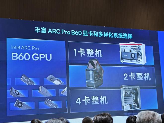 英特尔的端侧AI布局,已从最初的工作站,游戏本逐渐扩展到轻薄本以及迷你主机。除此之外,英特尔还展示了配备单卡或双卡ARC B60的小型工作站以及采用至强W处理器加四张ARC B60的部门级工作站,英特尔构建了层次分明的产品矩阵,无论是赋能智能座舱、智能家居的AI Box,还是提升车载智能与NAS功能的解决方案,酷睿Ultra的算力正无处不在。