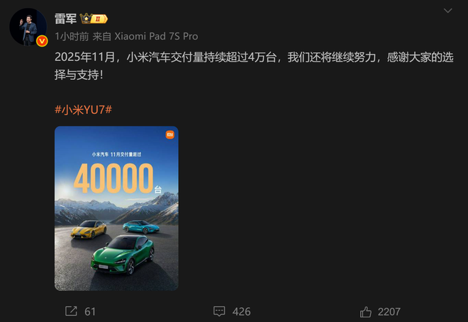 今日,雷军在社交平台宣布,2025年11月小米汽车的交付量已持续超过4万台,并表示将继续努力,感谢消费者的选择与支持。自从9月小米汽车的交付量首次突破4万台后,这一数字已经连续三个月保持稳定,展现了其强劲的市场表现。