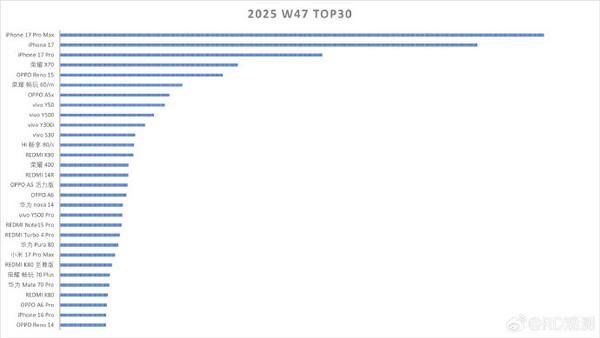 近日,有数码博主曝光了第47周国内手机市场销量TOP30机型榜单。数据显示,苹果旗下iPhone 17系列凭借多机型协同优势占据榜单前列,而国产手机在中端及入门级市场表现亮眼,成为销量主力。