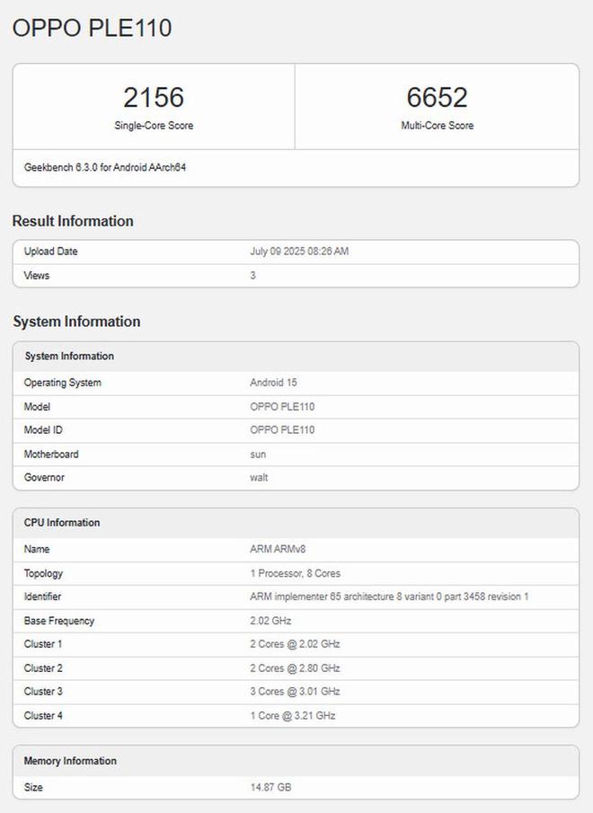 海外科技媒体Gsmarena近日报道,OPPO K13 Turbo手机现身GeekBench跑分库。根据跑分数据,6.3.0版本的单核成绩为2156分,多核成绩为6652分。跑分页面显示该机型号为PLE110,并且根据GSMA IMEI数据库的信息,确认该机为OPPO K13 Turbo。