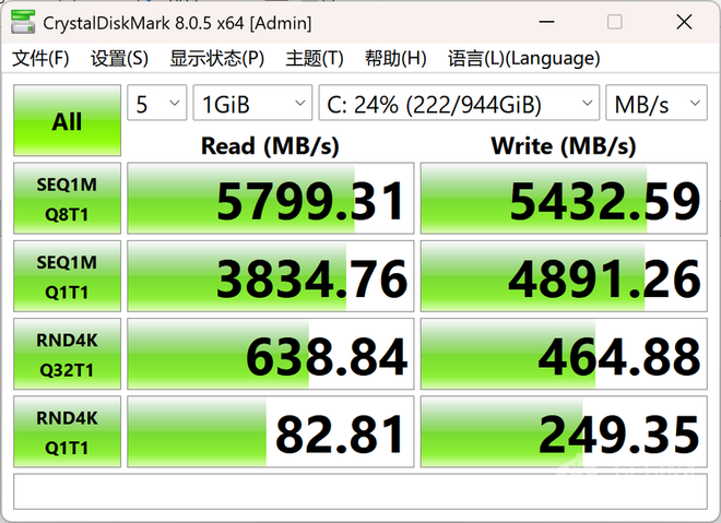 从测试结果来看,该硬盘连续读写速度分别为5799.31 MB/s、5432.59 MB/s,4K随机读写速度达到了82.81 MB/s和249.35 MB/s,速度达到了主流PCIe 4.0 SSD的水平,搭配1TB的大容量,足以满足日常使用和游戏的需求,双硬盘位的配备也能够满足更大容量的存储需求。