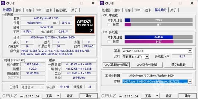 首先是大家熟悉的CPU-Z,锐龙AI 7 350单核得到789.5分,多核成绩为6449.6分,单核成绩和多核成绩都表现不错,日常使用乃至轻度生产力工作都能够胜任。