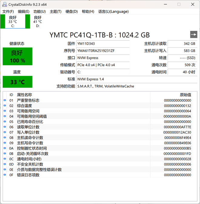 储存方面,通过CrystalDiskInfo可以看到,喵Book14 Pro采用了来自长江存储的PC41Q 1TB PCIe 4.0 SSD,采用了自家的QLC闪存颗粒,是目前不少国内厂商采用的OEM专供硬盘产品。我们也通过CrystalDiskMark测试了这块硬盘的读写速度。