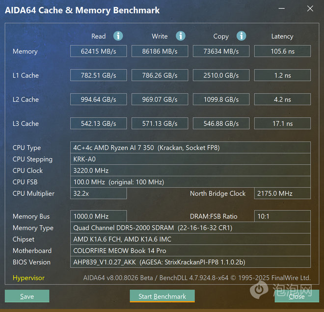 内存方面,喵Book14 Pro配备了32GB DDR5 5600MT/s内存,更大的容量搭配双通道设计,足以满足日常使用和生产力需求。在AIDA64 Cache&Memory Benchmark的测试中,内存读取、写入、复制速度分别为62415 MB/s、86186 MB/s、73634 MB/s,速度相当迅猛,105.6ns的延迟表现也在正常范围内。