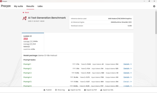 在UL Procyon AI Text Generation Benchmark中,针对各类本地大模型的加载以及输出token的速度,喵Book14 Pro的表现也十分出色,我们测试的LLama-3.1-8B项目获得232分平均延迟和每秒Token数量也都有着出色的表现,证明其性能可以充分满足上述AI大模型的使用需求。