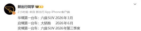 根据爆料信息,奕境第一台车的车型同样为六座SUV,将于明年第三季度正式发布。而华境将于2026年3月发布,车型为六座SUV。