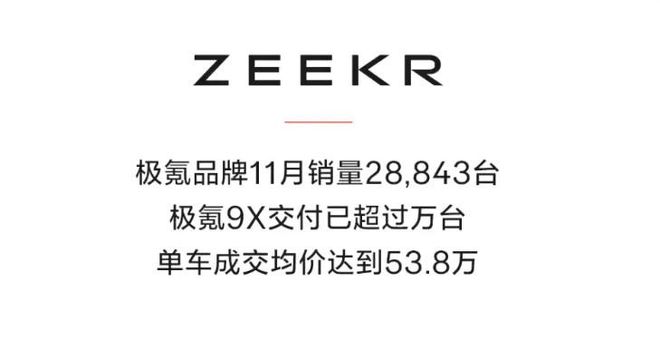 极氪在11月的交付量是28843辆,其中极氪9X更是声称已交付超过万台,且单车成交均价在53.8万,这是让我所没有想到的。毕竟,极氪9X定位高端豪华大型SUV,一般人的确也很难买得起,但没想到居然卖得这么好,真让人有些意外。极氪这个品牌目前车型也挺多的,要说问题,还是加大力度把智驾再做好点吧,其它都没毛病。