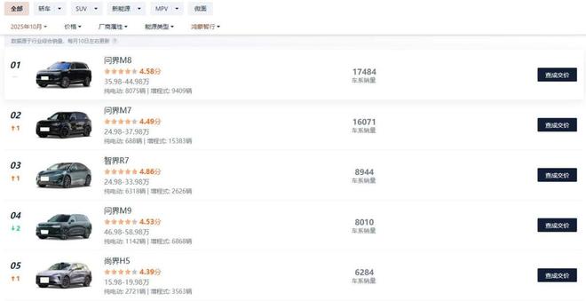 销量层面,目前我们还未拿到这10款车型在11月份的具体交付数字,但基于10月的销量数据我们基本可以判断到,排在销量前五位的车型应该是问界M8/M7、智界R7、问界M9以及尚界H5这5款。
