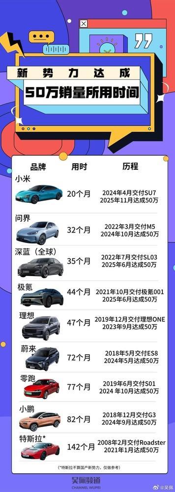 新势力车企销量突破50万台用时排名,小米领先,仅用20个月达成目标
