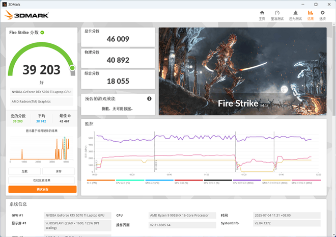 在3DMark的Fire Strike(DX11+1080P渲染分辨率)测试中,总成绩为39203,其中GPU分数为46009。