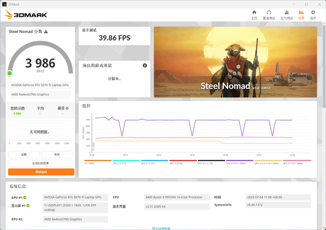 在3Dmark中测试可靠性、稳定性和持续性能的Steel Nomad测试中,总成绩为3986,其中GPU测试成绩为39.86FPS。
