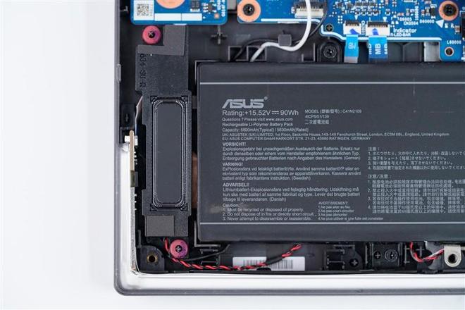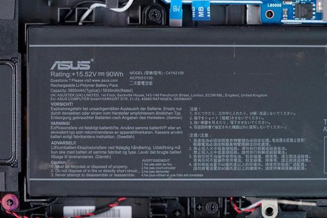 ROG魔霸9笔记本内置锂电池铭牌特写,90Wh容量可以直接带上飞机。