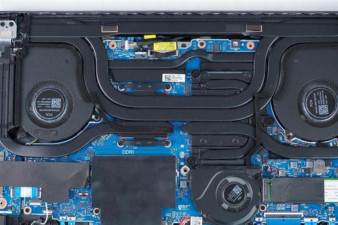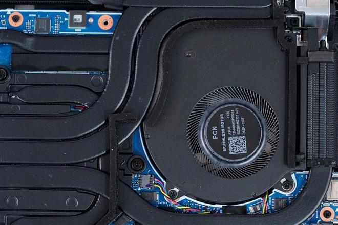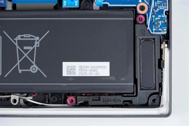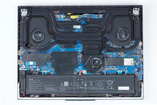 取下底盖后的ROG魔霸9笔记本内部结构全貌,注意ROG魔霸9笔记本底盖11颗螺丝中右下角的那一颗是防丢螺丝设计,无法完全取下。