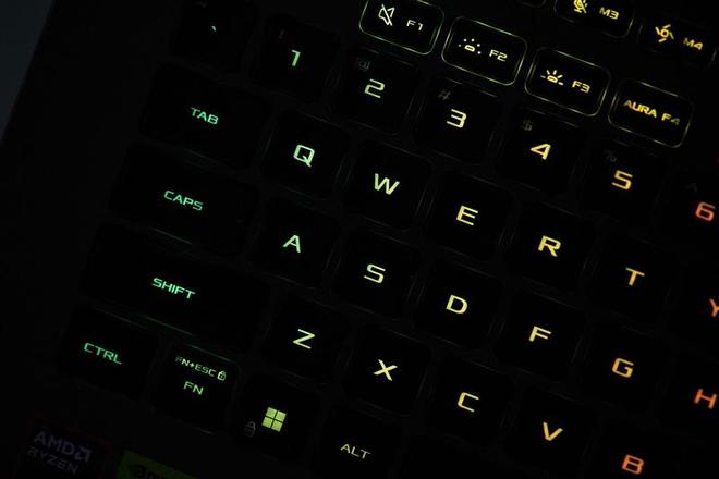 ROG魔霸9笔记本C面的影刃键盘,长键程全尺寸键盘支持单键RGB灯效,全高方向键设计,右上角同样设计了斜切的涂鸦式暗纹。