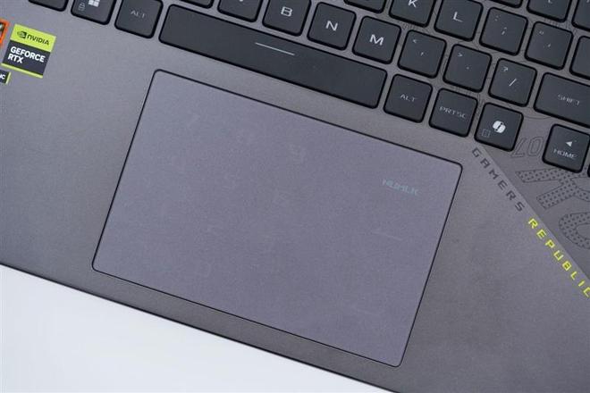 ROG魔霸9笔记本宽大的触控板,支持虚拟数字键盘功能。
