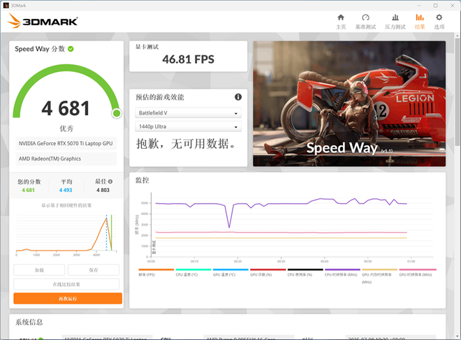 在3DMark测试综合性能的Speed Way测试中,总成绩为4681,其中GPU测试成绩为46.81FPS。