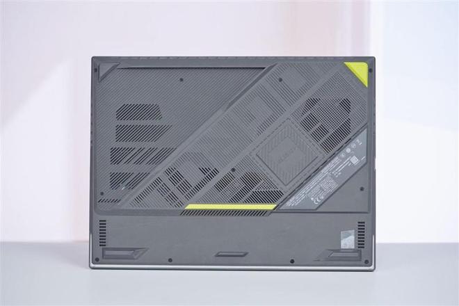 ROG魔霸9笔记本的底部设计细节,同样融入了斜切设计。
