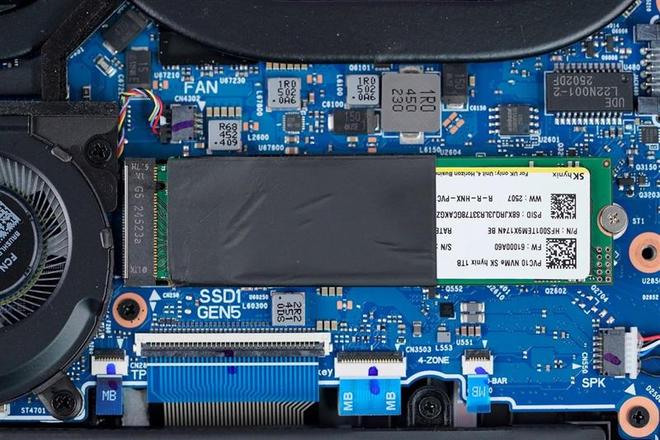 ROG魔霸9笔记本自带一条1TB容量的PCIe 4.0 SSD,有石墨烯散热贴包裹。