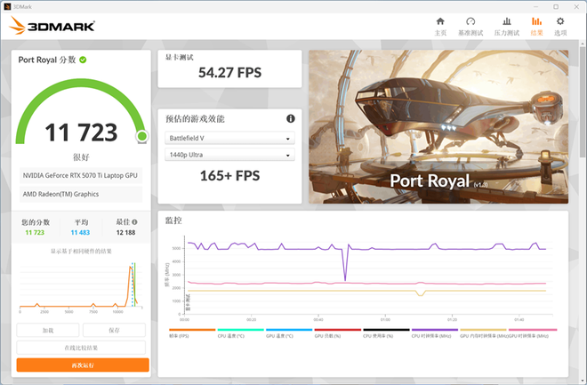 在3Dmark中测试实时光追性能的Prot Royal测试中,总成绩为11723,其中GPU测试成绩为54.27FPS。