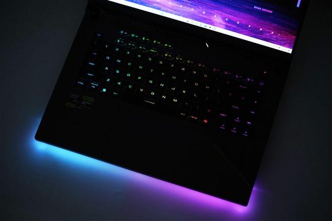 ROG魔霸9笔记本还配备了U型底盘灯,同样支持RGB神光同步,在黑暗处映照桌面十分华丽。