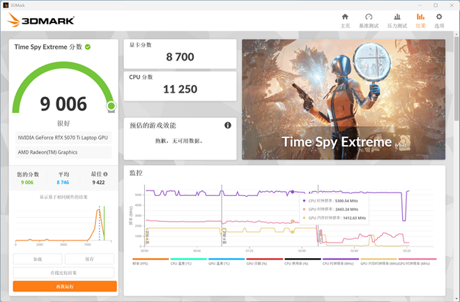 在3DMark的Time Spy Extreme(DX12+4K渲染分辨率)测试中,总成绩为9006,其中GPU分数为8700。