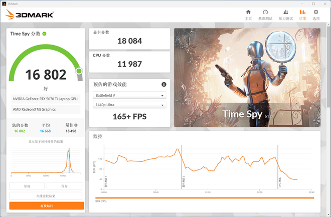 在3DMark的Time Spy(DX12+2K渲染分辨率)测试中,总成绩为16802,其中GPU分数为18084。