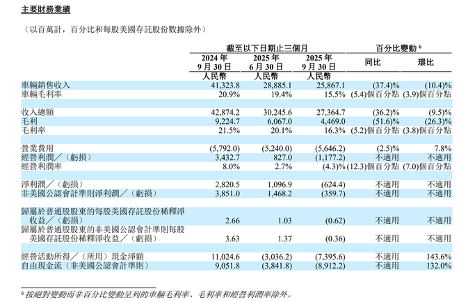 然而,这一良好势头在第三季度戛然而止。第三季度,理想汽车总收入为274亿元人民币,同比下降36.2%,净利润从去年同期的盈利28亿元转为亏损6.24亿元。其毛利率也下跌至16.3%。第三季度理想汽车自由现金流转负至-89亿元。
