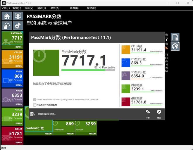锐龙7 8700G总分7717,CPU分数31191,2D图形分数869,3D图形分数6354。