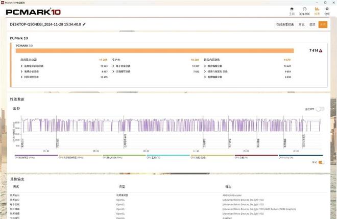 锐龙7 8700G PCMark 10现代办公总分为7414,具体下来,常用基本功能(应用启动、视频会议、网页浏览)为11204,生产力(电子表格、文档编写)10208分,数位内容创作(照片编辑、渲染、视频编辑)分数为9670。