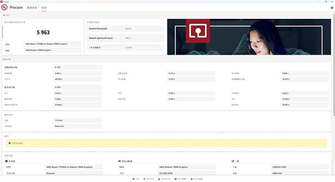 锐龙7 8700G照片编辑基准测试分数5963,图形装饰分数8127,批处理分数4376。