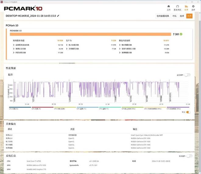 i7-14700整机分数7381,略低于锐龙7 8700G,其中常用基本功能为10928分、生产力9238分、数位创作7381分。