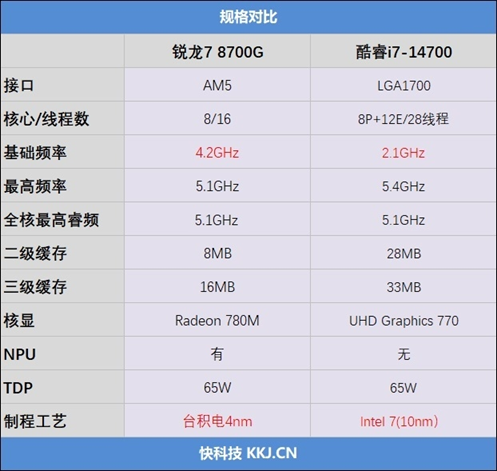 虽然2款处理器TDP都是65W,但锐龙7 8700G采用的是台积电4nm制程工艺,而i7-14700则是Intel 7制程工艺(实际是10nm增强版),相差整整2代。