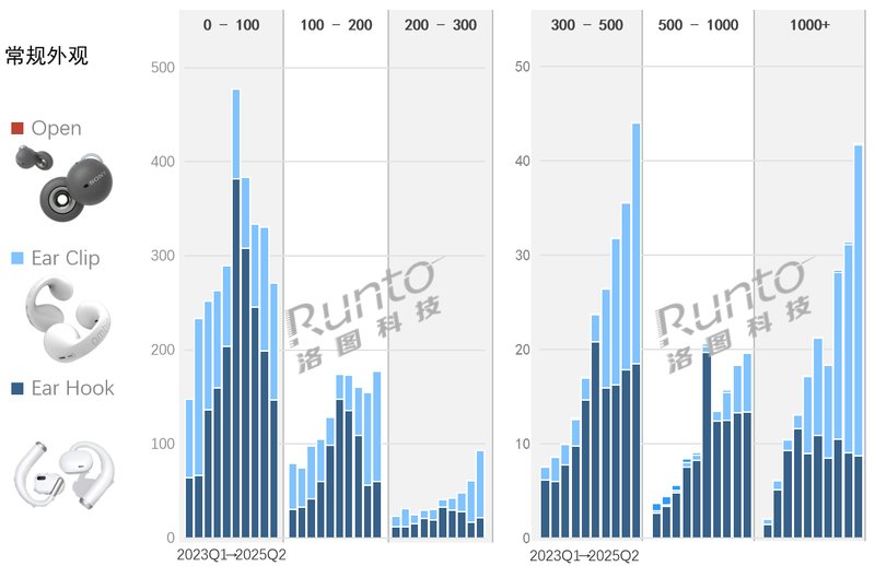 2023-2025Q2中国真无线开放式耳机传统电商市场分外观和价格段销量