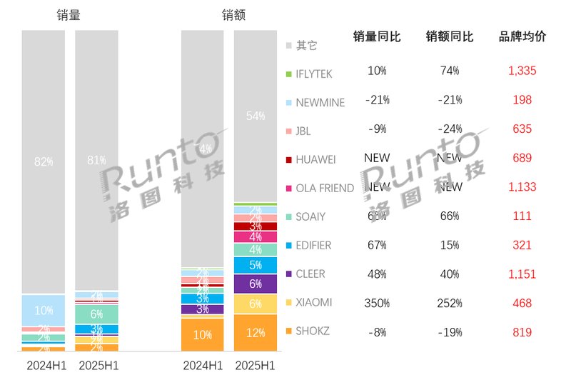 2025H1中国真无线开放式耳挂耳机传统电商市场品牌销售表现及变化