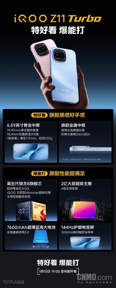 值得一提的是,iQOO Z11 Turbo的核心性能平台由第五代骁龙8移动平台、自研电竞芯片Q2,以及iQOO 15同款的Monster超核引擎共同组成,并辅以冰穹双网散热系统。影像方面,新机后置搭载2亿像素大底超级主摄,支持4倍无损变焦。续航是一大亮点,该机内置7600mAh超薄蓝海大电池,并采用全局直驱供电2.0技术。另外,新机将于1月15日发布。