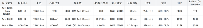 从目前曝光的信息来看,Arc B770显卡的硬件规格相当亮眼。该显卡工程样品的额定热设计功耗(TDP)高达300W,这一数据不仅大幅超越了前代旗舰显卡Arc A770的225W,也显著高于同系列Arc B580显卡的190W,足见其定位高性能的产品导向。为支撑如此高的功耗释放并保障性能表现,BMG-G31核心预计将采用台积电5nm工艺制造,核心规格上则集成32个Xe2核心,对应4096个着色器单元,硬件基础相当扎实。显存配置方面,Arc B770显卡有望搭载16GB GDDR6显存,配合256-bit位宽及19 Gbps的显存速度,其总显存带宽将达到608 GB/s。相较于Arc B580的456 GB/s带宽,这一数据实现了质的飞跃,理论上能为高分辨率游戏运行及复杂计算任务处理提供更流畅、稳定的体验。