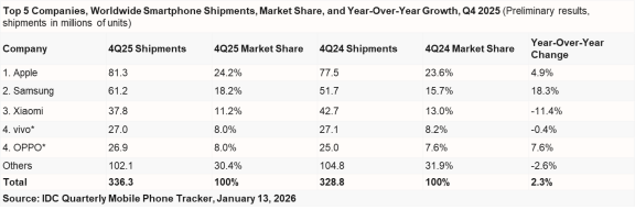 1月14日 ,国际数据公司IDC 发布2025年全球智能手机市场跟踪报告, 2025年全球智能手机总出货量累积12.6亿部,同比增长1.9%,智能手机市场延续复苏态势。第四季度受高端手机的持续增长以及消费者预期价格上涨的积极影响,出货量达3.363亿部,同比增长2.3%。