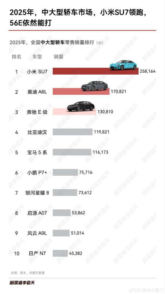 数据显示,小米SU7以258164辆的销量成绩稳居榜首。奥迪A6L以170821辆位居第二,奔驰E级和比亚迪汉分别以130810辆和119821辆紧随其后,宝马5系则以116173辆排名第五。尽管传统“56E”(宝马5系、奥迪A6L、奔驰E级)依然保持强劲竞争力,但小米SU7等国产新能源汽车的强势崛起,标志着新能源汽车尤其是国产新势力在中高端市场已实现实质性突破。