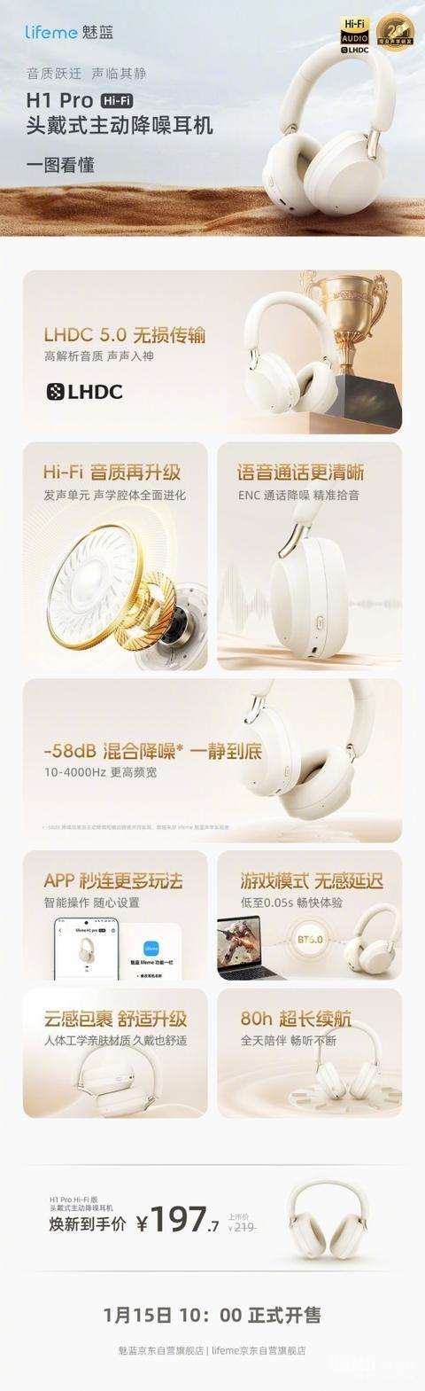 魅蓝H1 Pro Hi-Fi版头戴式降噪耳机支持LHDC 5.0无损传输技术和ENC通话降噪功能。-58dB混合降噪技术,能够有效降低外界噪音干扰。续航能力是该耳机的一大亮点,它拥有长达80小时的超长续航。游戏模式下,延迟低至0.05s,为游戏玩家带来更加流畅的游戏体验。