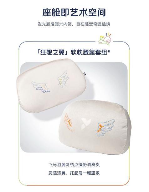 内饰方面,萤火虫天马狂想曲特别版延续了品牌一贯的米色温暖基调,麂皮材质与外观相呼应。细节处的设计尤为考究:从羽翼刺绣的“狂想之翼”软枕腰靠套,到地毯上的天马元素图案,每一处都蕴含精致工艺。值得一提的是,此特别版配备了艺术家亲笔签名标识,并提供独一无二的NFC卡片钥匙与配套彩绘家充桩。