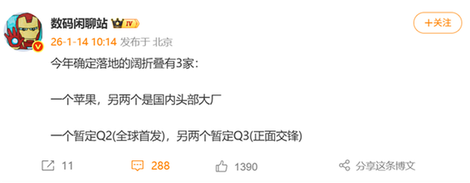 今年将有三家品牌推出阔折叠机型,其中包括苹果和两家国内领先厂商。根据计划,苹果的首款可折叠iPhone预计将在第二季度全球首发,而另外两家国内品牌的机型则定于第三季度发布。