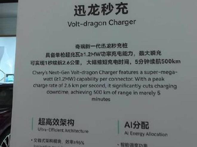 其次是1.2兆瓦的迅龙秒充。比亚迪的兆瓦闪充我们都已经见识过了吧,但现在奇瑞造的可更牛逼,怎么说呢?因为厂家声称:这个1.2兆瓦指的是单枪充电功率,那这放在行业里可是第一的水平。另外,厂家还表示,搭载迅龙秒充的车型可以做到充电5分钟、续航500km。如此一来,这台星途ES8身上的卖点是不是就更足了呢?
